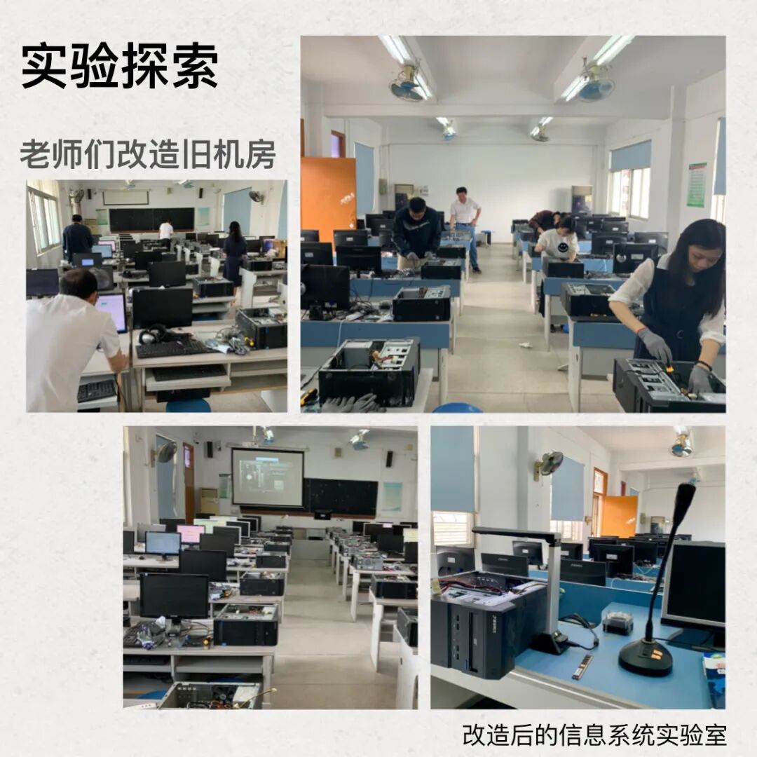 为提高学生的动手能力,让学生在动手体验中真切、直接地理解、掌握信息系统的相关内容,信息组的老师花了一个多月的时间,克服重困难,无中生有,将废旧的计算机教室改造成了信息系统实验室。实验室能容纳16个小组同时操作,完成信息系统的硬件组装到网络配置。