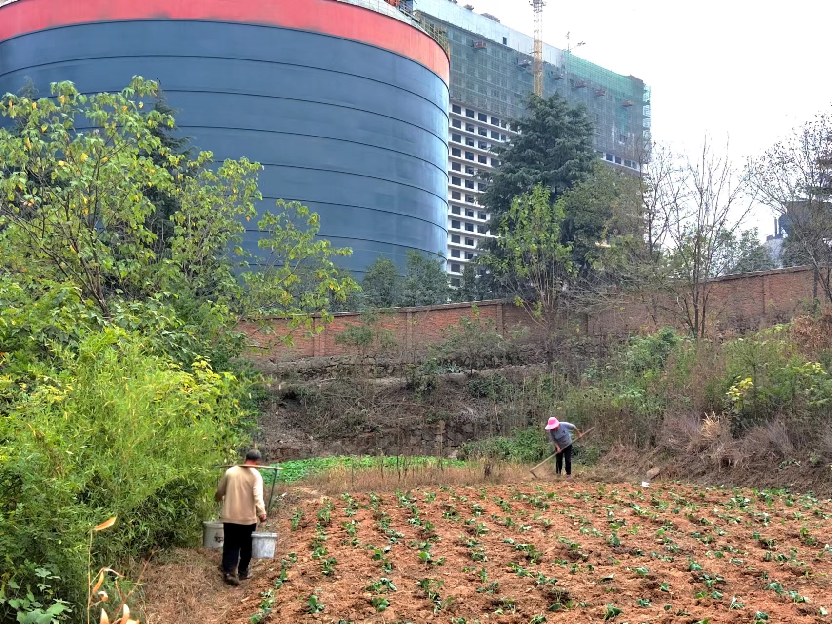 村民在养猪大楼和水泥厂旁边的农田里种菜。图源:记者吕雅萱