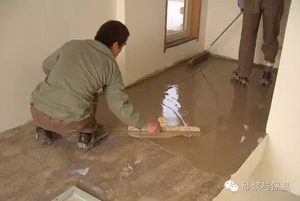 地面的平整程度和大致的落差走向——用2米长的靠尺对地面进行检测,在100平方米范围内,选取不少于5个测量点,在每个测量点中选取3个最低点,用15个最低点来计算平均值,决定施工厚度;确定顺平地面的高低走向,并在墙面上作好标记,施工时选择从高点往低点方向施工。圈定特别低的地方,要先进行局部施工,施工过程和正常的施工工艺一样,待24H后,再进行整体施工!