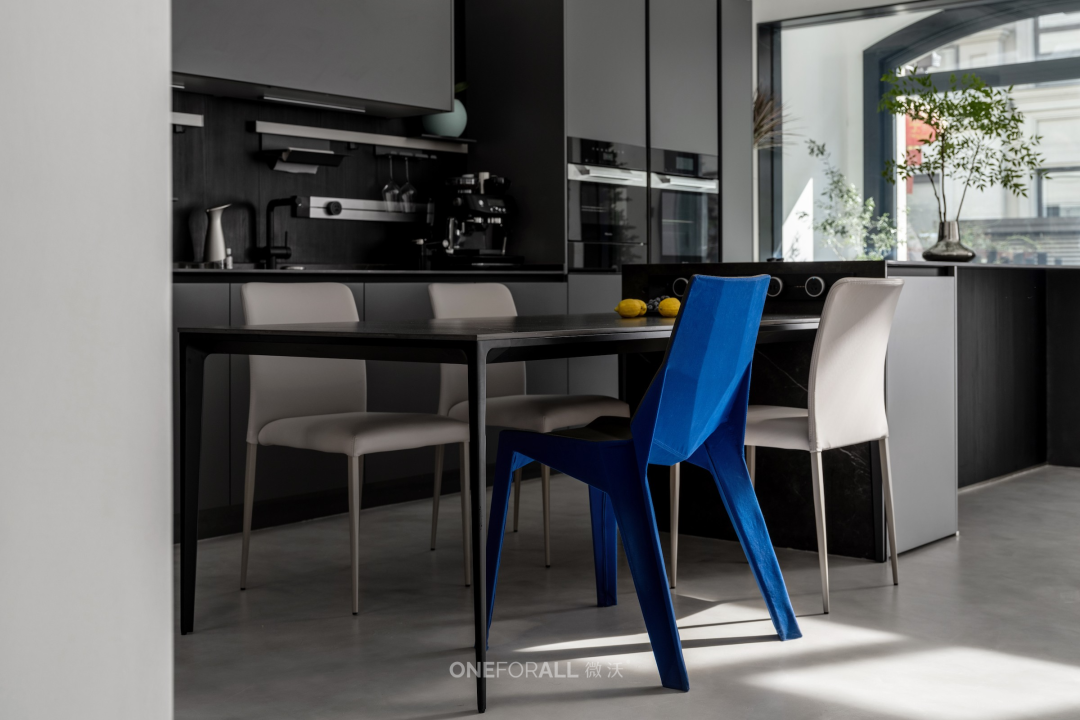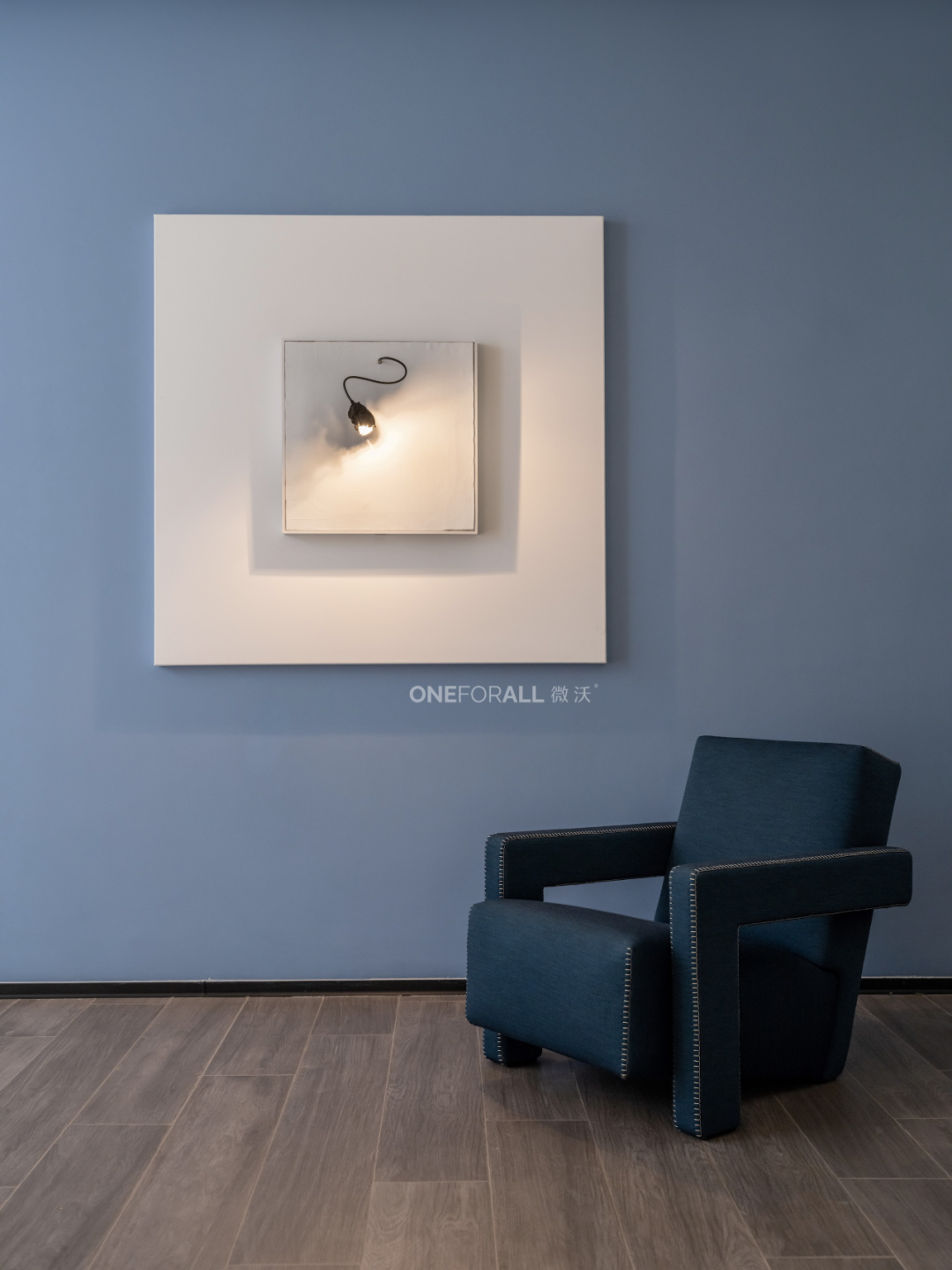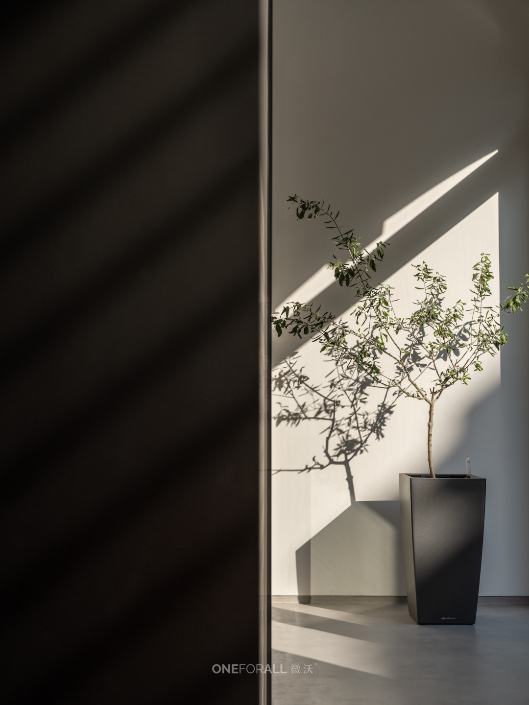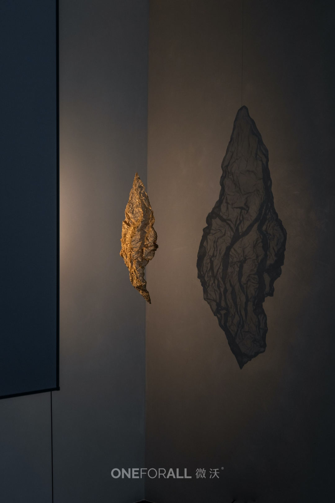 绒面漆这款艺术涂料斑驳有致、略带阴阳面的表面质感让空间极简中带上了一丝值得品味的厚重,整体美观雅致,近看也别有洞天。