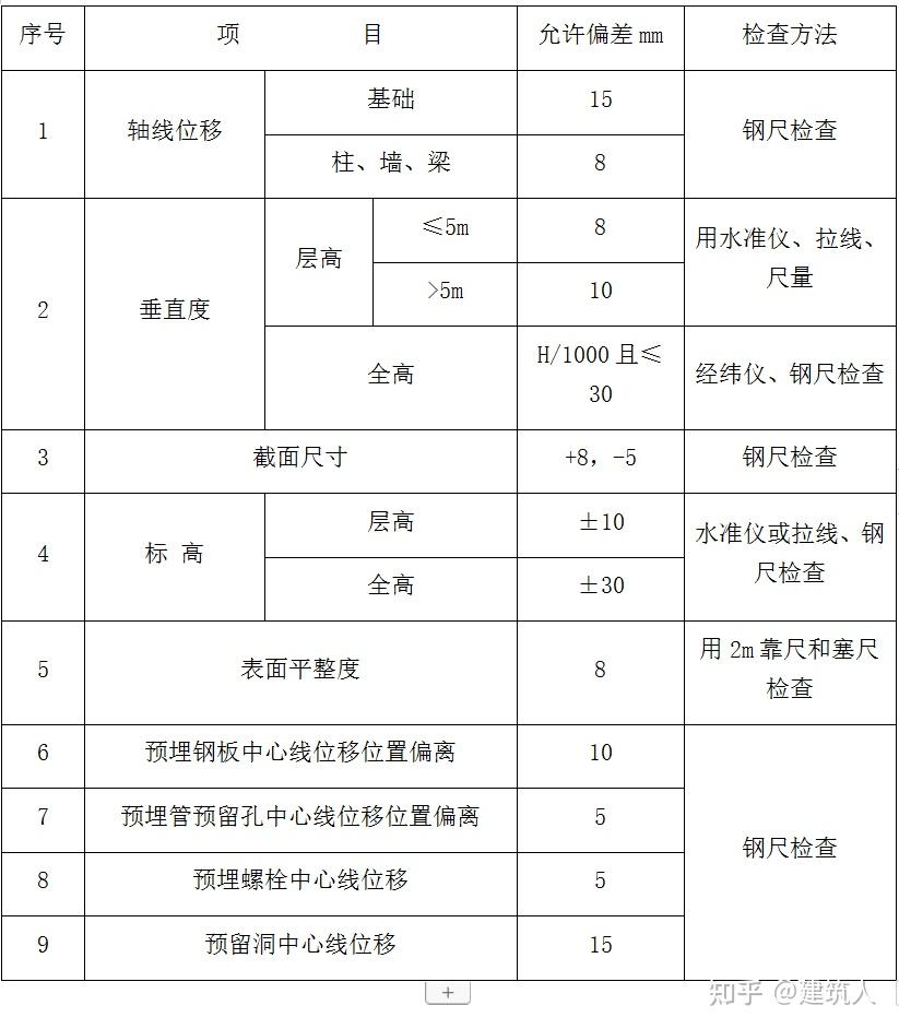 检查数量:按楼层、结构缝或施工段划分检验批。在同一检验批内,对梁、柱和独立基础,应抽查构件数量的10%,且不少于3件;对墙和板,应按有代表性的自然间抽查10%,且不少于3间;对大空间结构,墙可按相邻轴线间高度5m左右划分检查面,板可按纵、横轴线划分检查面,抽查10%,且均不少于3面;对电梯井,应全数检查。对设备基础,应全数检查。