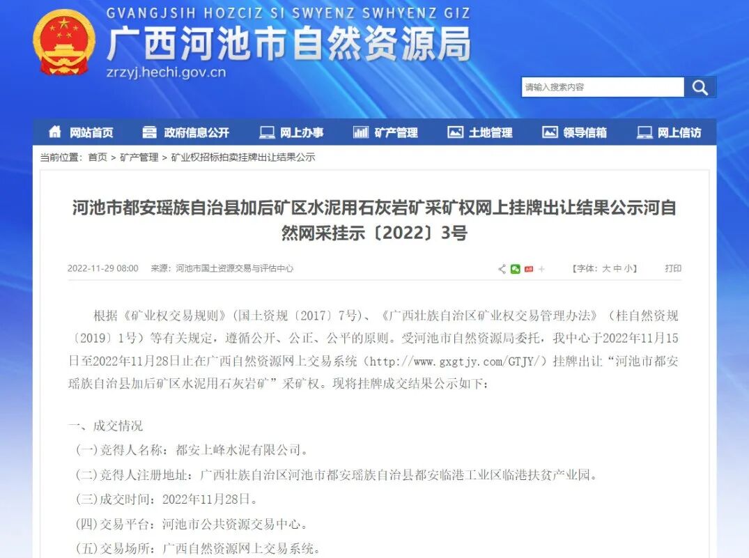 11月28日,河池市自然资源局通过广西自然资源网上交易系统挂牌出让河池市都安瑶族自治县加后矿区水泥用石灰岩矿采矿权,都安上峰成功竞得。该矿权是河池市首宗成功出让的“净采矿权”,是河池市统筹推进重大项目配套的石灰石矿开采项目。