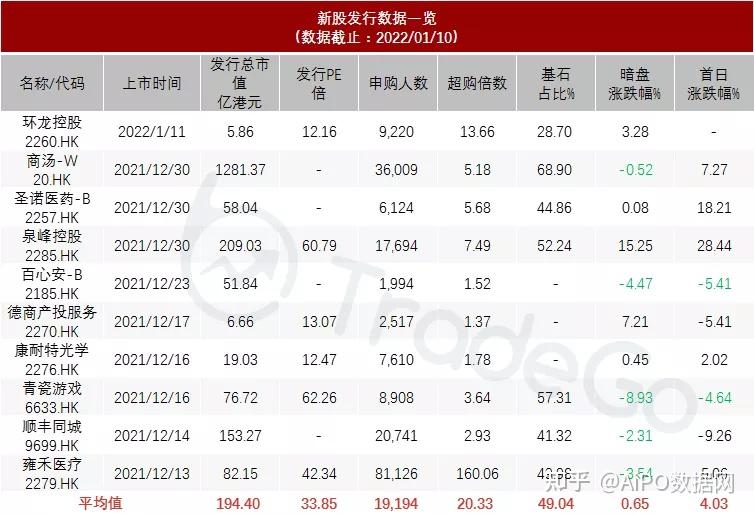 据捷利交易宝数据统计,近10家上市新股发行总市值均值为194.40亿,其中最大市值为商汤-W,最小市值为新上市的环龙控股;发行PE均值为33.85倍,整体中上水平;申购人数均值为19194人;超购倍数上,如去掉最热倍数,平常均值应为4.81倍左右;基石占比上,目前基石大约均维持在40%以上,整体来说,比例相对合理;暗盘及首日收益率上,2021年12月下旬整体表现有所好转,2022年开年首只新股表现不差。