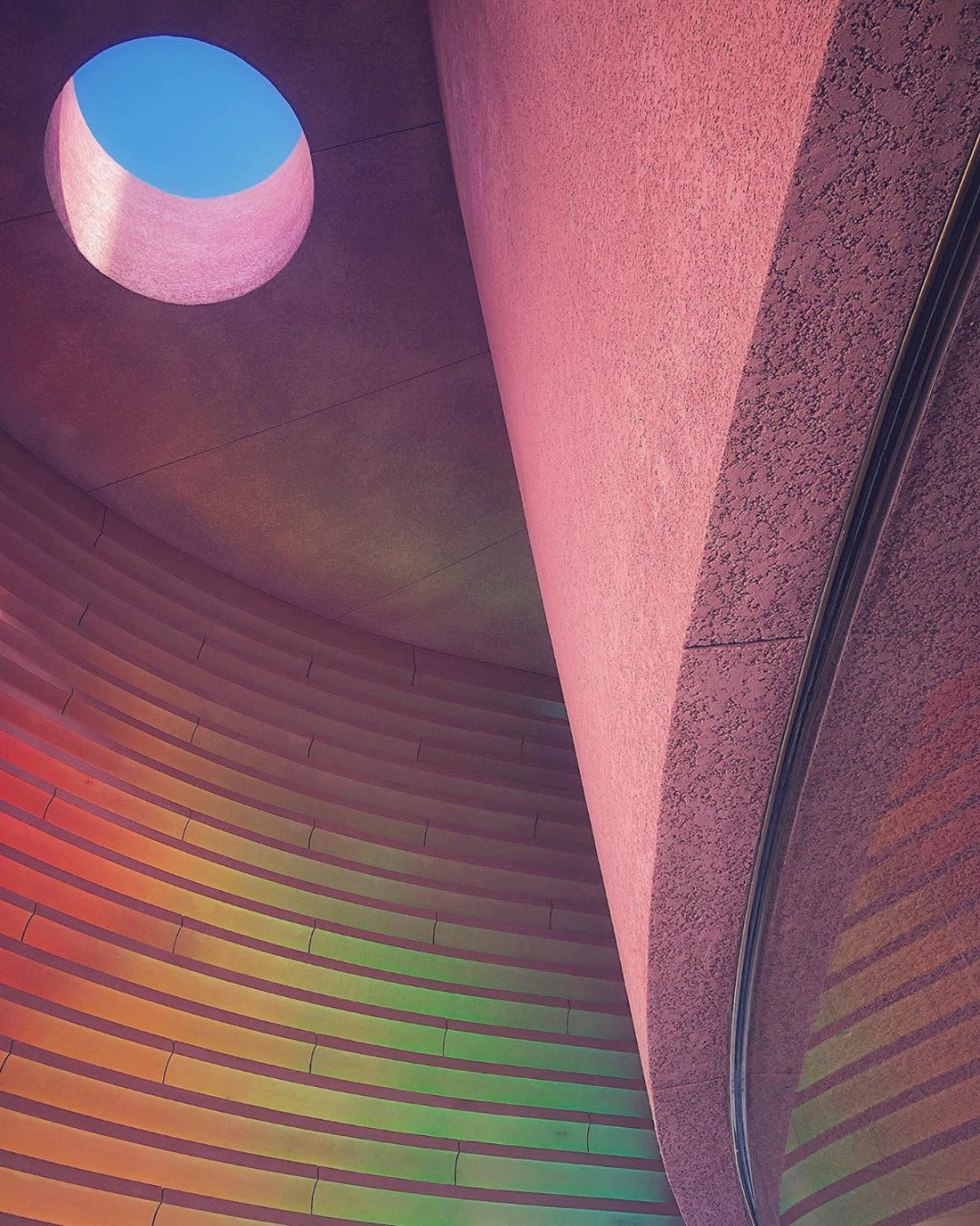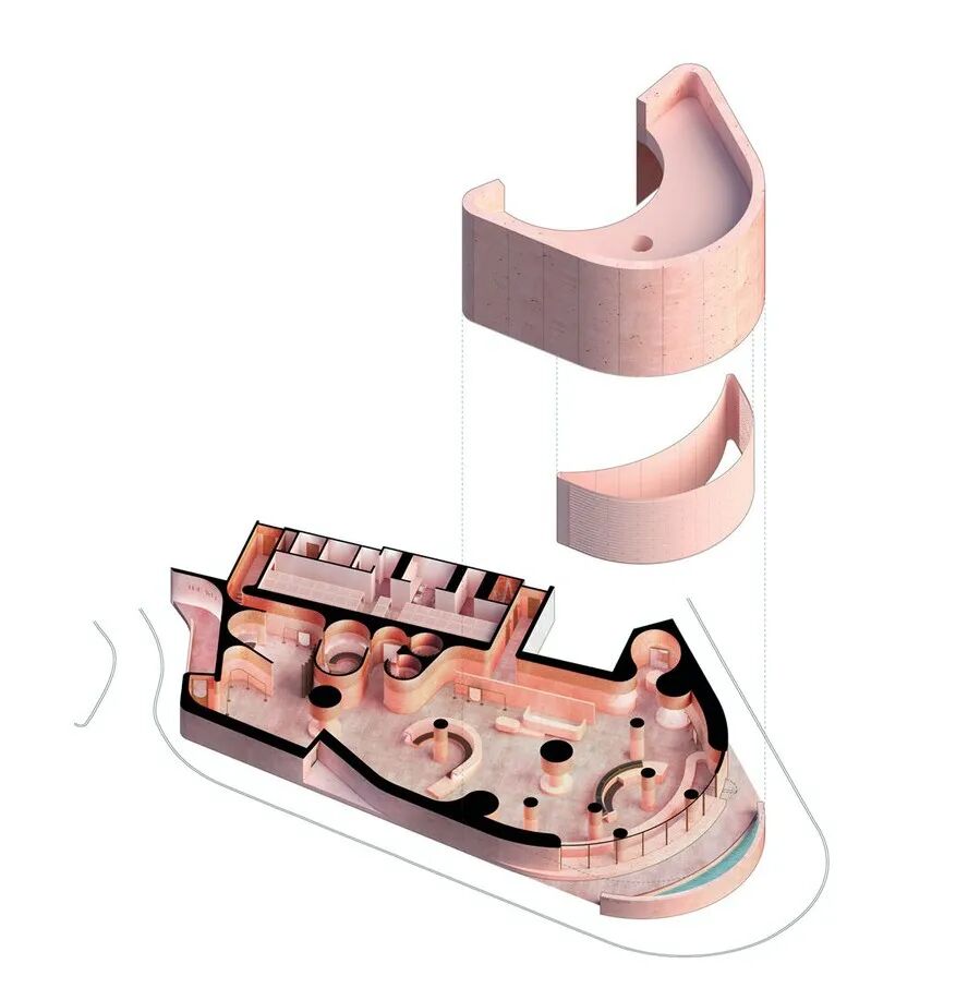 美国的贝弗利中心是一个有着 40 年历史的购物中心,一直以来都是当地非常知名的商场,曾经经历过2次大型的改造 ▼改造前改造施工过程 ▼店铺位于弗利中心项目的一侧,整个商场这项翻新工程耗资 5 亿美元,花费数年才完成。店铺体块分析图建筑的外立面混凝土的制作过程 ▼再通过吊车安装到外面 ▼完工后,一个粉红色的混凝土结构覆盖了建筑的外立面,而且最令人惊叹的是超大的立板,没有一个横向接缝▼一层缩进去的一块形成雨棚,也让入口更有识别性 沿街立面的一个凹陷处,可以通过这里的橱窗看到内部 ▼粉色混凝土外立面与周围的植物、原本建筑已有的白色网格状立面图形成了几位好看的对比与虚实结合,既有颜色的碰撞,又有材质的冲突 ▼整栋建筑的曲线立面覆盖着粉红色的混凝土,给人一种「坚韧而柔和」的效果,既与野兽派建筑的其余部分形成对比,又与之互补。当你走进有遮盖的入口里面,便会被上方的圆孔吸引眼球,这可以说是整个设计最为点睛的一笔,在室内的部分也能见到 ▼这个圆孔能将外面的光线照进入口的空间当中 ▼天空的蓝色与粉色的建筑形成对比,在室内的人一抬头就能被如此美丽的画面所吸引 ▼除此之外,你还能看到在内部的建筑墙上,大卫·阿贾耶设置了一系列带状的照明设施,用来照亮内部的空间。当粗糙的混凝土材质表面被搭上柔和的光芒,粉红色在这里更加明亮而迷人 ▼灯光的颜色还是可以调整的,可以变换成不同的颜色,更加光彩动人 ▼从入口处往上看,整个建筑的圆环形状和灯光形成了非常美丽的图画 ▼
