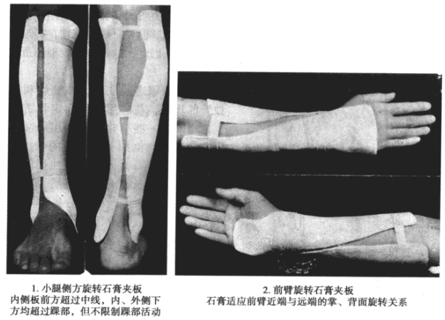 而有些则更接近于局部固定,例如小腿的侧方旋转石膏夹板,实为内前侧对外后侧夹板,仅其下端超过两踝;前臂的旋转石膏夹板,只包括腕关节(图7)。