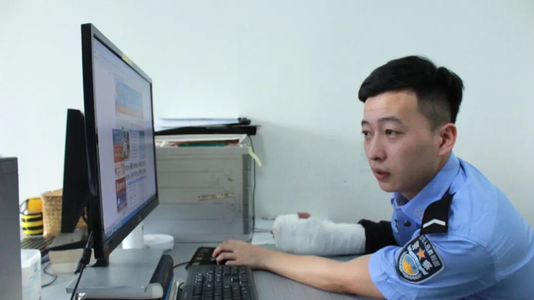 9月8日上午10时许,杨先生来到乐清市公安局北白象派出所报警称,停在自家院子里的一辆电瓶车不见了。民警施亨浩随即给杨先生制作报案笔录。看着眼前一只手打着石膏,只留另外一只手敲击键盘打字的民警,杨先生有些困惑,施亨浩解释这是前段时间不小心摔伤造成的。制作完笔录后,施亨浩带队前往现场调查取证。通过调阅现场公共视频,施亨浩发现了嫌疑人的踪迹,经过进一步研判分析,很快确定了嫌疑人的身份信息。△打着石膏的施亨浩