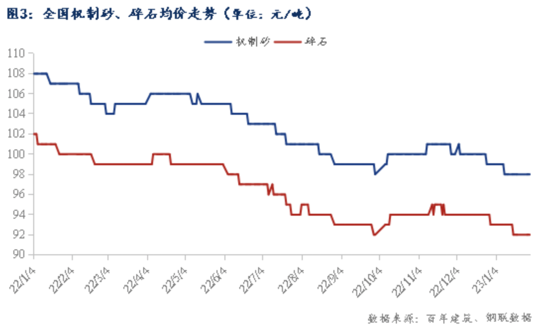 截至2023年1月底,百年建筑网水泥价格指数449.94,同比下降16.99%,月环比下降3.67%。华东,春节前需求回落,价格继续回落10-20元/吨,春节期间虽有少量项目不停工,但出库量零星,节后部分区域水泥价格小幅下跌10元/吨,刺激下游发货,行情弱势持稳。华南,节前水泥价格回落40-50元/吨,前期厂家停窑,价格高位支撑,一月以后需求接近尾声,价格加速回落至低位。西南,春节前后,市场需求降至冰点,市场水泥价格支撑不足,价格回落,川渝、云南、贵州水泥价格下跌40-90元/吨。华中,春节前后,需求下滑,前期厂家停窑保价,一月需求基本接近尾声,价格逐步回归,价格下跌30-50元/吨。华北、西北、东北,春节前后,项目停工,市场基本无成交,厂家继续停窑,供需停滞,市场休市,京津冀等部分区域价格下跌30元/吨,回落到基础价位,为节后市场准备,市场有价无市。1.2.2 2023年1月混凝土原材成本分析——砂石