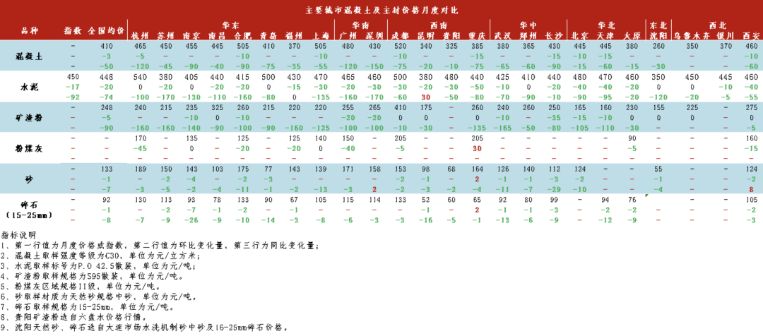 据百年建筑网统计,截至2023年1月底,百年建筑网C30非泵混凝土均价为410元/方,环比下跌0.73%,全国混凝土价格偏弱运行。1月正值春节,国内七大区除少部分重点项目不停工外,多数工地均陆续停工,市场需求降至冰点,企业工作重心也转移至回款层面。华东部分地区原材水泥价格有所下跌,疫情放开后受人员变动影响,工地施工进度提升受限,水泥出库量下降。随着生产成本以及市场需求双双下行,混凝土价格小幅下跌。西南重庆等地部分企业受资金压力以及回款情况不佳影响,为抢占项目有意压价。华南地区广州、深圳等地水泥价格有所下跌,受资金影响企业主动减产。华中、华北地区原材价格有部分回落,1月份企业均以稳定供应以及回款为主,加之北方地区工地整体停工较早,需求不足。东北和西北部分地区受天气以及疫情影响,多数工地均在1月中上旬停止施工,西北地区除少数市政项目不停工外,其余均陆续停产,需求回补受限。而东北大部分地区受寒冷天气影响较大,工地结束施工期较早,发运量一度跌停。整体看来混凝土市场需求在1月尚未回暖。随着各地新开工项目的筑底,多数企业将在2月中上旬陆续复工,届时混凝土发运量或将有所提升。但当前市场仍处于缓慢复苏状态,预计后续全国混凝土市场恢复有限。1.2 2023年1月混凝土及原材价格对比