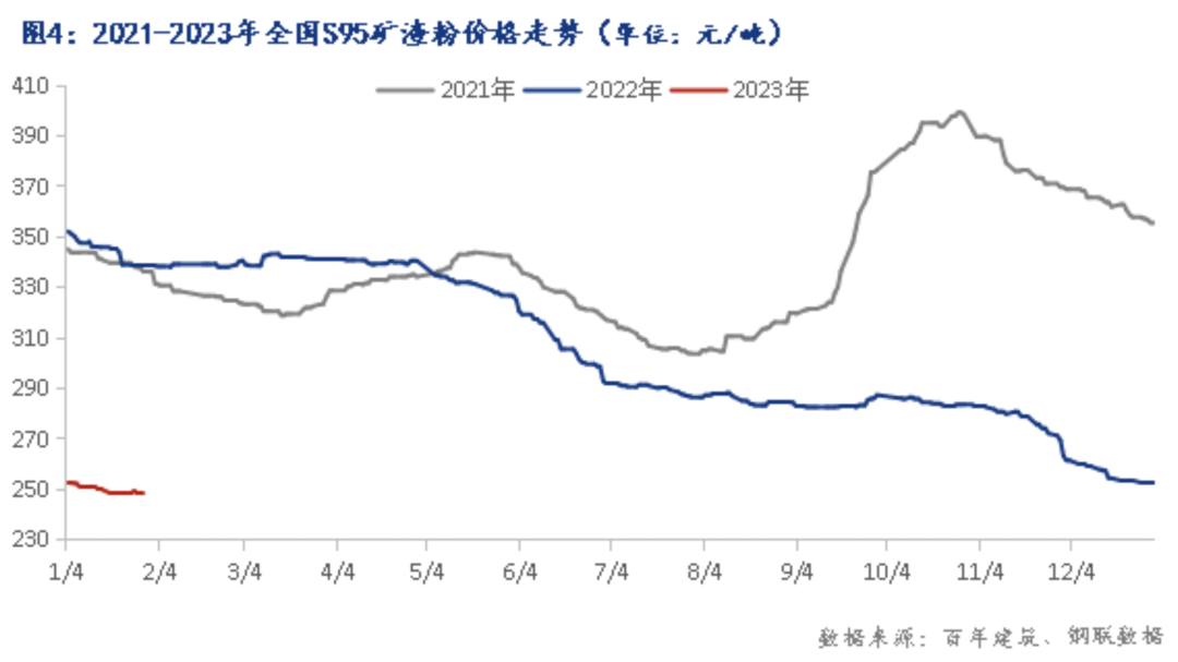 截至2023年1月底,全国砂石综合均价107.67元/吨,年同比下跌6.92%,月环比下跌0.92%。据百年建筑网数据统计,全国重点18个城市砂石市场价格变化情况来看,1月各区域价格涨跌互现。华东地区:截至2023年1月31日,华东地区砂石均价119.71元/吨,环比下降1.33%。其中天然砂均价148.29元/吨,环比下降0.76%;机制砂均价108.57元/吨,环比下降1.68%;碎石均价102.29元/吨,环比下降1.78%。1月份,华东迎来工人返乡,节前需求持续下滑,砂石价格偏弱运行。华中地区:截至2023年1月31日,华中地区砂石均价104.22元/吨,环比下降1.57%,其中天然砂均价126元/吨,环比下降1.31%;机制砂均价96.33元/吨,环比下降1.7%;碎石均价90.33元/吨,环比下降1.81%。1月份,华中大部分项目节前都已经停工,市场参与者重心转至回款,砂石实际需求不高,砂石价格下跌。华南地区:截至2023年1月31日,华南地区砂石均价112.78元/吨,环比持平,其中天然砂均价143元/吨,环比持平;机制砂均价105.33元/吨,环比持平;碎石均价90元/吨,环比持平。华南1月迎来“返乡潮”,项目逐渐停工,节前厂家出货以清库存为主,整体砂石价格难有涨势,以稳为主。西南地区:截至2023年1月31日,西南地区砂石均价93.92元/吨,环比上升0.09%;其中天然砂均价120.75元/吨,环比下降0.21%;机制砂均价83.5元/吨,环比上升0.3%;碎石均价77.5元/吨,环比上升0.32%。1月西南部分厂家外发砂石需求稍有回暖,砂石价格稍有提高,西南整体砂石价格稳中偏强运行。华北地区:截至2023年1月31日,华北地区砂石均价102.33元/吨,环比下降1.92%;其中天然砂均价122元/吨,环比下降1.61%;机制砂均价91元/吨,环比下降2.15%;碎石均价94元/吨,环比下降2.08%。华北1月受寒冷天气影响,本地需求趋于零,加上年底司机多已放假过节,出货量难有新增,砂石价格下跌。西北地区:截至2023年1月31日,陕西砂石均价112.33元/吨,环比下降1.75%;其中天然砂124元/吨,环比下降1.59%;机制砂均价为108元/吨,环比下降1.82%;碎石均价105元/吨,环比下降1.87%。西北市场1月项目基本上都已经停工,砂石需求低,部分厂家选择停工放假,市场处于供需双弱的局面,砂石价格呈下行趋势。1.2.3 2023年1月混凝土原材成本分析——矿渣粉