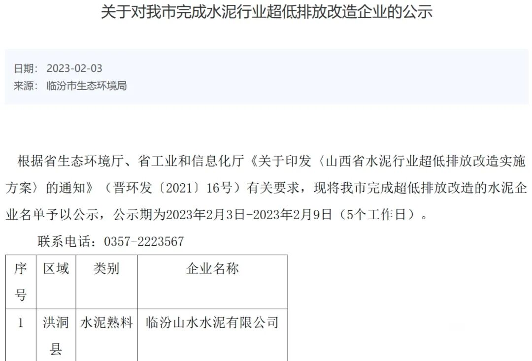 近日,临汾市生态环境局发布《关于对我市完成水泥行业超低排放改造企业的公示》,《公示》内容显示,临汾市洪洞县山水水泥完成超低排放改造。
