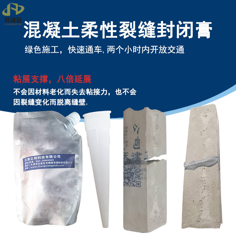 混凝土裂缝柔性接缝剂不会因材料老化而失去粘接力,也不会因裂缝变化而脱离缝壁;凝固后可达到8倍的延展长度,当裂缝变大时可随之变长,大大减少了二次开裂的概率,同时具有较强的韧度,能有效支撑裂缝壁,防止啃边和塌壁,从而防止裂缝扩大和蔓延。