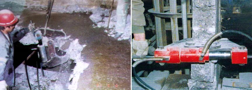 3.液压钳破碎拆除3.1原理液压钳破碎是钢制钳口在高压油缸推动下,对钢筋混凝土进行局部静力挤压、剪裂,破坏混凝土结构,从而进行混凝土拆除破碎。钳口破碎砼厚度在150-400mm,适用于钢筋混凝土墙体、钢筋混凝土楼板、梁、柱、楼梯等破碎拆除。3.2施工特点(1)整个操作过程低噪音、无振动,是一项无噪音污染和无振动影响的粉碎解体混凝土构件的工艺方法。(2)专用机械结构简单、分体式、体积小、刚性强、移动性好、粉碎压力大。(3)是一种施工效率高、劳动强度低的粉碎工艺方法。(4)粉碎结构混凝土的同时,可保留和不损伤原结构混凝土内的配置钢筋,保证了与原结构的连接加固。 (5)液压钳粉碎混凝土工艺方法,不能获得整齐划一的界面,为此必须进行二次人工清边工作。3.3施工工艺流程及注意事项施工准备 →标定粉碎边界→支搭操作平台→组装连接液压钳→钻头开洞→粉碎作业→切断钢筋→渣土清运。液压钳粉碎混凝土的强度等级,一般适用于C35及以下混凝土结构构件。液压钳粉碎混凝土工艺方法,必须具备可容纳设备和操作人员的空间;当现场条件不具备足够工作空间或不能创造工作面空间时,不能采用本方法。3.4液压钳拆除示意图