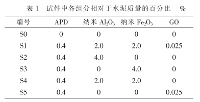 目前,防止混凝土干缩的主要方法是添加膨胀剂、抗干缩剂、纤维、内养护剂、矿物掺合料等。本文先制备两性分散剂APD,再用其与活性纳米Al2O3、纳米Fe2O3及氧化石墨烯(以下简称GO)混合制备新型抗干缩剂,利用其诱导效应、晶核效应、模板效应来促进水泥水化,调控水化产物的形貌和结构,提高混凝土的体积稳定性,减少混凝土在硬化过程中因干缩产生的裂缝,从而提高混凝土的力学及耐久性能,以期为制备高性能、长寿命的混凝土奠定基础。