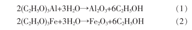 将3.335 g三乙醇铝和2.507 g三乙醇铁分别溶于100 g 的50%乙醇水溶液,在85~90 ℃下搅拌2 h,再减压蒸馏除去乙醇,控制Al2O3和Fe2O3分散液50 g及含固量4.2%,制备反应方程式见式(1)、式(2)。